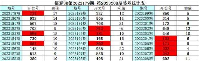 上期回顾:福彩3D第2023208期奖号为:692,其中奖号组选类型为:组六,奇偶比为1:2,大小比为2:1,012路比为2:0:1,和值为17,跨度为7。
