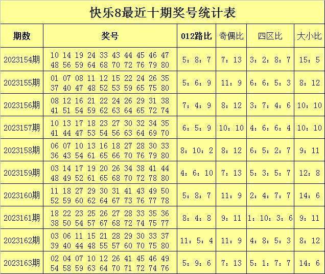福彩快乐8第2023163期开奖回顾:02 04 07 10 12 26 41 45 46 49 54 58 59 63 64 70 71 72 74 76,其中奖号012路比为5:9:6,四区比为5:1:7:7奇偶比为7:13,大小比为14:6。