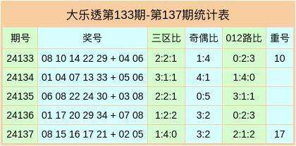 大乐透第24137期开出奖号为:08、15、16、17、21 + 02、05,前区三区比1:4:0,奇偶比为3:2,012路比为2:1:2,开出1枚重号17。