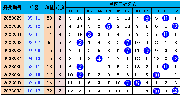跨度分析:上期后区跨度为2,比前期上升1个点位,预测本期跨度走势变化上升,推荐两码跨度5--10