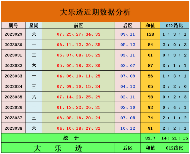 上期回顾:大乐透第2023038期奖号:前区04、10、18、27、32,后区10、12。前区奖号和值为91,三区比为2:1:2,后区开出大大组合10、12