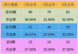 近50期,一区出号90个,二区出号79个,三区出号81个,三区数据比对1分区出号较多。