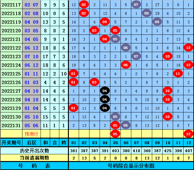 后区第一位推荐:在连续5期开奖中分别出号:04、04、01、05、05,均值为3。8,其中奇数奖号表现相对较热,本期没有转冷的迹象,注意再次出现,关注号码05。