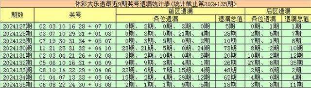 上期回顾:体彩大乐透第2024135期开出奖号为:06 08 22 24 30 + 03 08,其中前区各位奖号分别遗漏:2期、1期、1期、9期和5期,遗漏总值为18期,后区号码分别遗漏3期和8期,遗漏总值为11期。