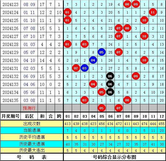 金大玄第2024136期体彩大乐透前区遗漏分析(定义,遗漏0-4期号码为热码,遗漏5-12期奖号为温码,遗漏13期及以上为冷码):