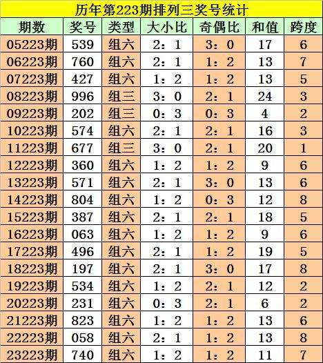 排列三第2023223期奖号:740,和值11,跨度7,大小比1:2,奇偶比1:2。