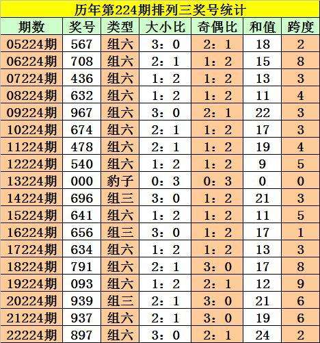 历年第224期奖号中:豹子开出1次,组三开出3次,组六开出14次。组六明显活跃,本期关注组六。