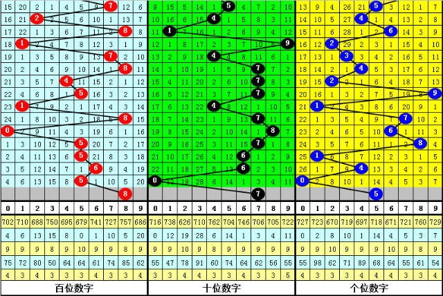 (2)在号码频次方面,开出个数最少的三个号码为:3、9、0,一般来说这三个号码不会同时出现,本期杀一码9;开出个数最多的四个号码分别为:4、7、8、5,本期看好这四个号码中包含1-2个开奖号码,胆码参考5。7。