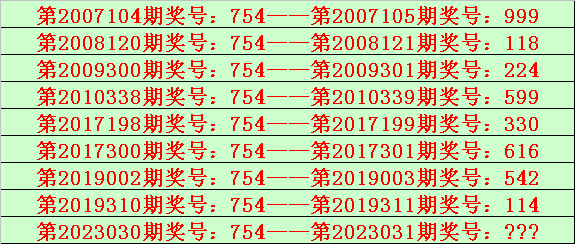 排列三第2023030期开出奖号754,该号码直选类型历史上出现了9次,前8次开出之后期下期奖号为:999、118、224、599、330、616、542、114,见下表: