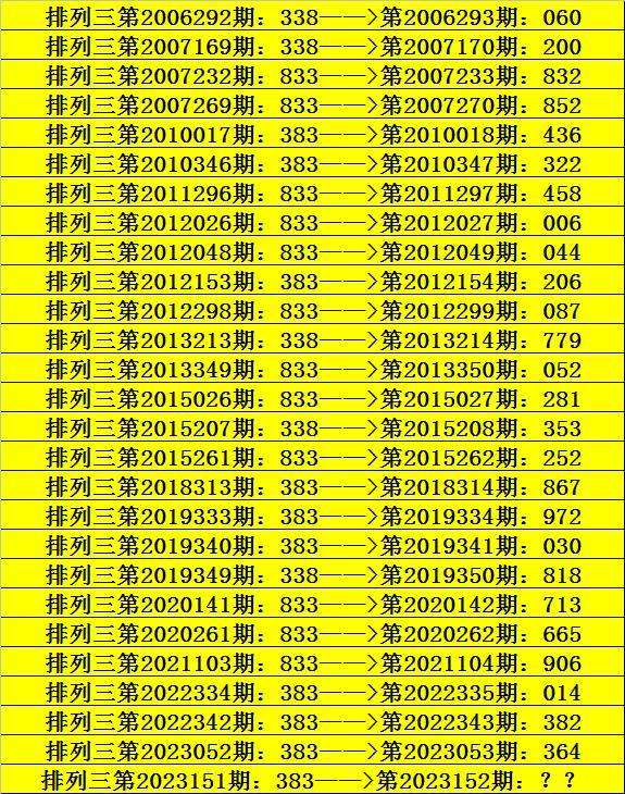 第2023151期排列三奖号为383,历史上该号码组选开出27次,下期奖号分别为:060、200、832、852、436、322、458、006、044、206、087、779、052、281、353、252、867、972、030、818、713、665、906、014、382、364。