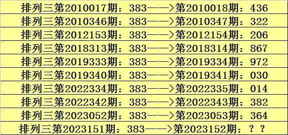 第2023151期排列三奖号为383,历史上该号码直选出现10次,下期奖号分别为:436、322、206、867、972、030、014、382、364。