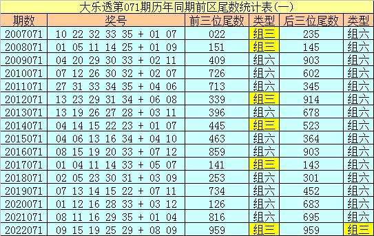 在大乐透第071期历年同期奖号中,前区前三位分别开出尾数:022-151-409-726-713-339-396-445-463-859-141-253-734-126-816-959,其中组六号码开出10次,组三号码开出6次,预计今年第071期前三位尾数号码为组六号码;