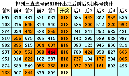 四、排列三直选号码818历史上开出9次,其前后五期奖号分别为: