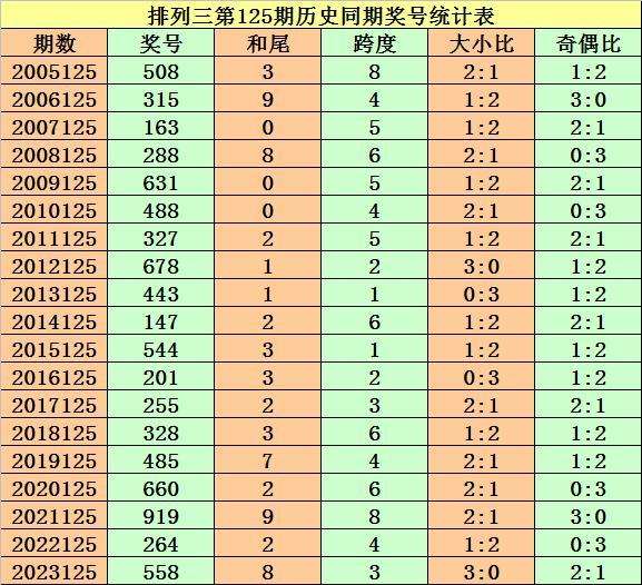 历年第125期排列三同期奖号开出:508、315、163、288、631、488、327、678、443、147、544、201、255、328、485、660、919、264、558。