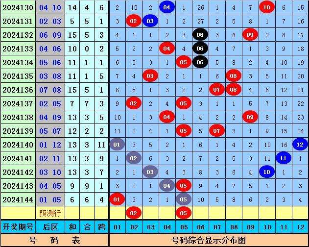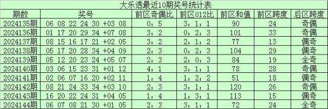 大乐透第2024144期开奖,前区:06、07、08、21、30;后区:01、05。其中前区和值为72,跨度为24,012路比为3:1:1,奇偶比为2:3,后区开出全奇、1路+2路组合。