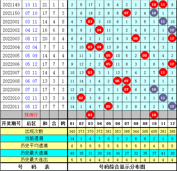 后区上期开出奖号:05+12,前6次后区奖号05+12出现之后,其下期分别开出号码:06+12、07+11、08+11、11+12、02+09、03+11,本期后区注意五码03 07 10 12,单挑两码03 10。