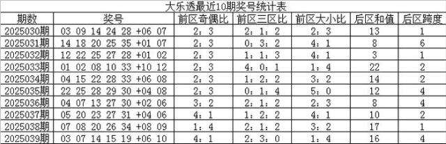 大乐透第2025039期开出奖号:03 07 14 15 19 + 06 10。其中前区号码三区比为2:3:0,奇偶比为4:1,大小比为1:4,后区开出一大一小、一奇一偶奖号。