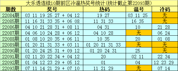 大乐透第22084期-第22093期前区奖号冷温热分布统计: