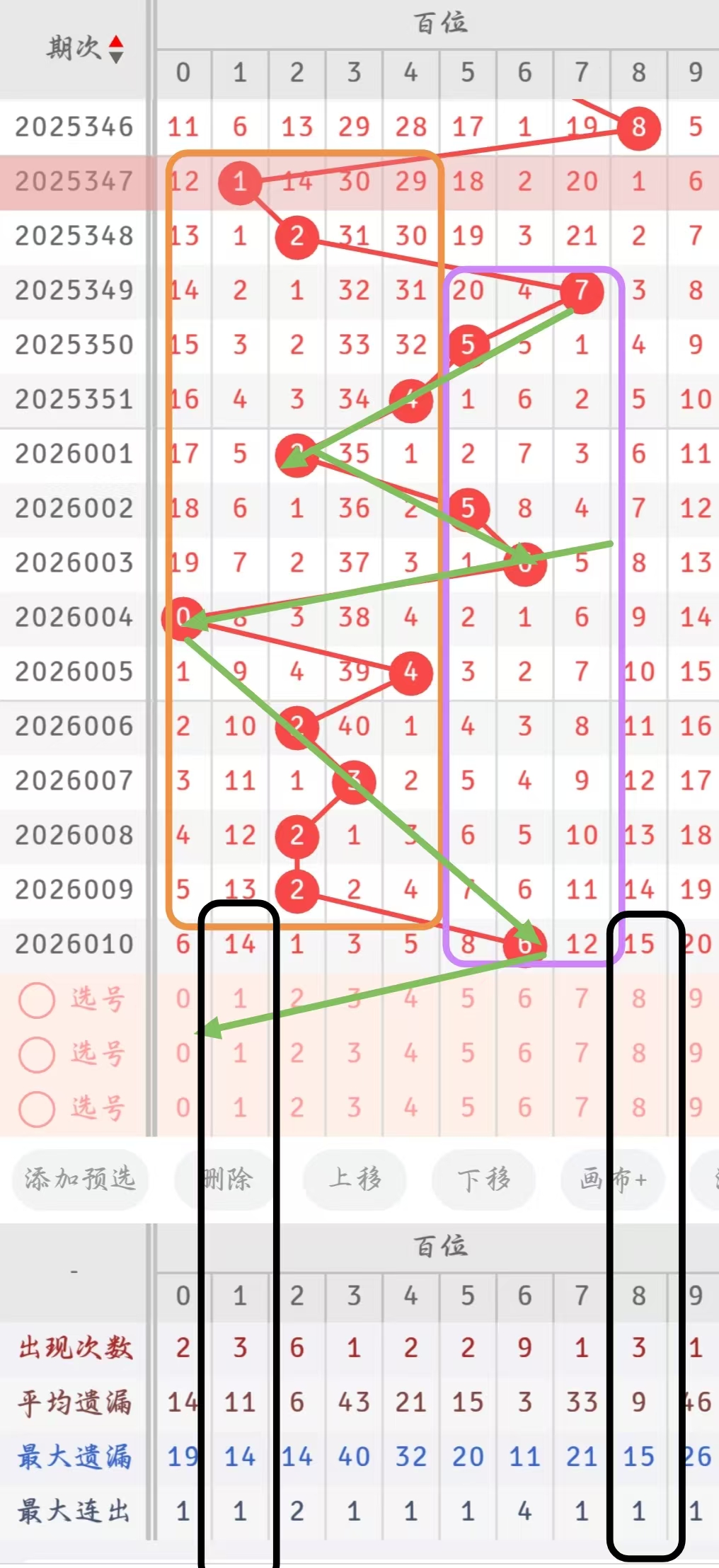同理分析本期百位奇偶数形态,可以看到近15期开出奇数号5期偶数号10期,开出偶数号的概率是开出奇数号概率的2倍且开出偶数号连出时最多3期,而上三期连续开出偶数号那么本期开出奇数的概率较大建议选择遗漏期数较大的奇数号。杀号建议定在所有偶数号,但偶数号8号已经遗漏了15期达到最大遗漏期数建议开出防冷号开出。