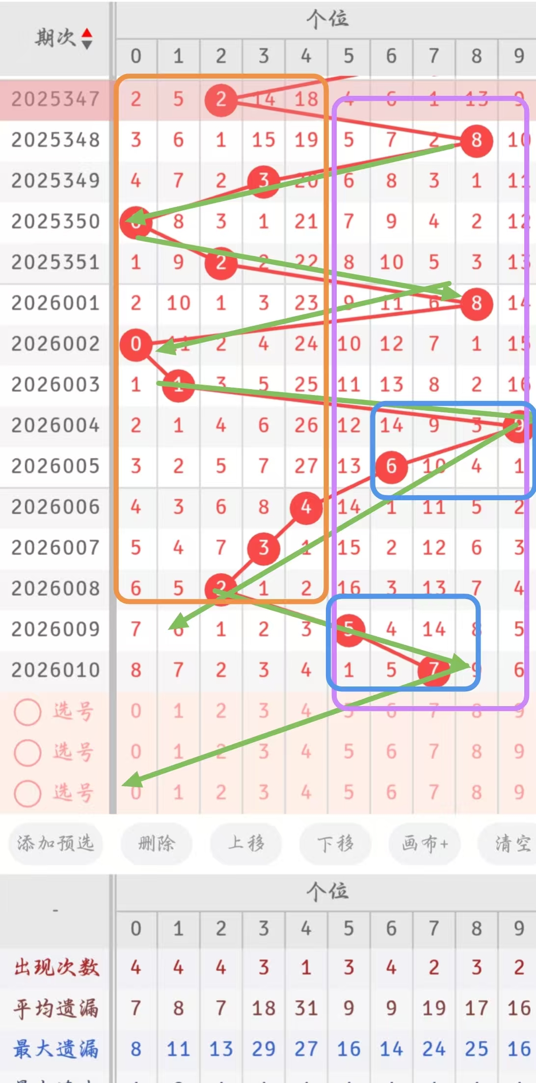 福彩3D第2026011期个位先分析奇数偶数,近15期开出奇数号6期开出偶数号9期,开出偶数号的概率稍大于开出奇数号的概率且奇数号连出不会超过两期,上两期已经连续开出奇数号那么本期开出偶数号的概率较大建议选择遗漏期数较多的偶数号开出。