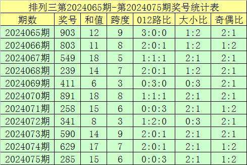 开奖回顾:排列三第2024075期奖号开出:285,组选类型:组六,大小比为2:1,奇偶比为1:2,和值为15,跨度为6。
