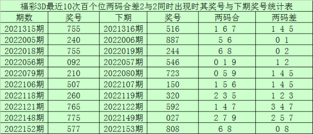 百个位合差分析:上期奖号百个位开出57组合,两码合为2,两码差为2,最近10次百个位两码合2与两码差2同时出现时,其奖号和下期奖号分别为: