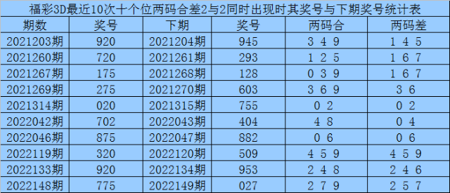 从以上统计可以看出,十个位两码合差2与2同时出现之后其下期两码合差表现最热的4个分别为:0246,本期十个位两码合差可以参考这四码中的数据。