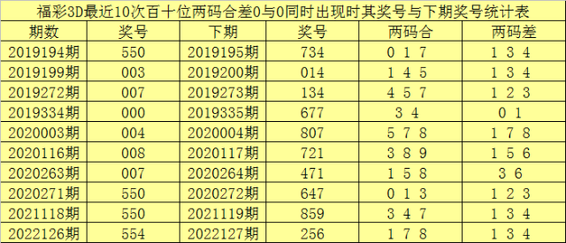 百十位合差分析:上期奖号百十位开出55组合,两码合为0,两码差为0,最近10次百十位两码合0与两码差0同时出现时,其奖号和下期奖号分别为: