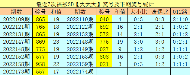 开奖回顾:福彩3D第2022173期开出奖号557,其中奖号奇偶比为3:0,大小比为3:0,012路比为0:1:2,和值为17,跨度为2。