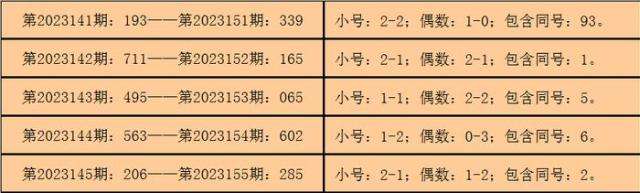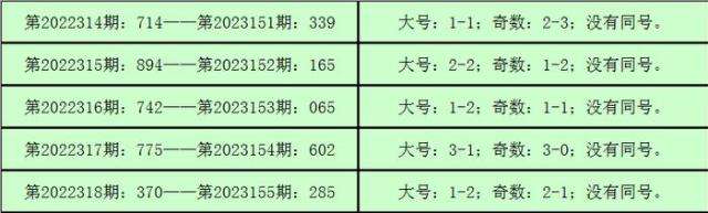 则,3D第2022319期开出奖号:221,其大小比为0:3,奇偶比为1:2,012路比为0:1:2,与3D第2023156期奖号可能没有同号。