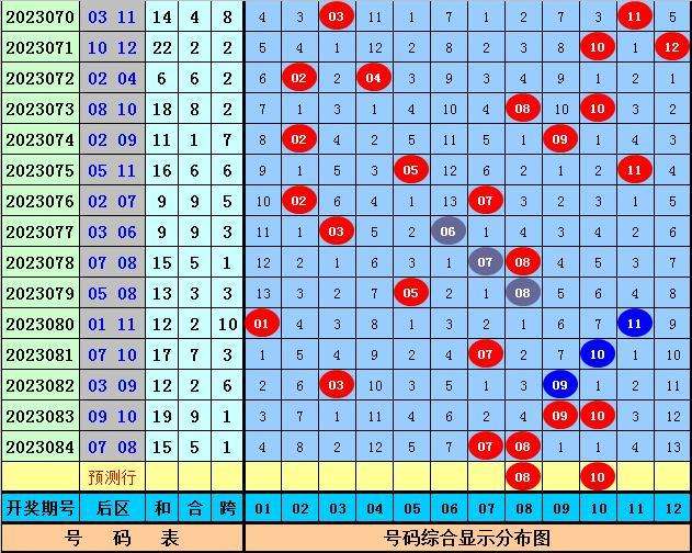 体彩大乐透第2023085期后区分析:后区上期开出奖号:07+08,为全大组合,本期预计大号继续走热,防再出全大组合,关注两码08、10。