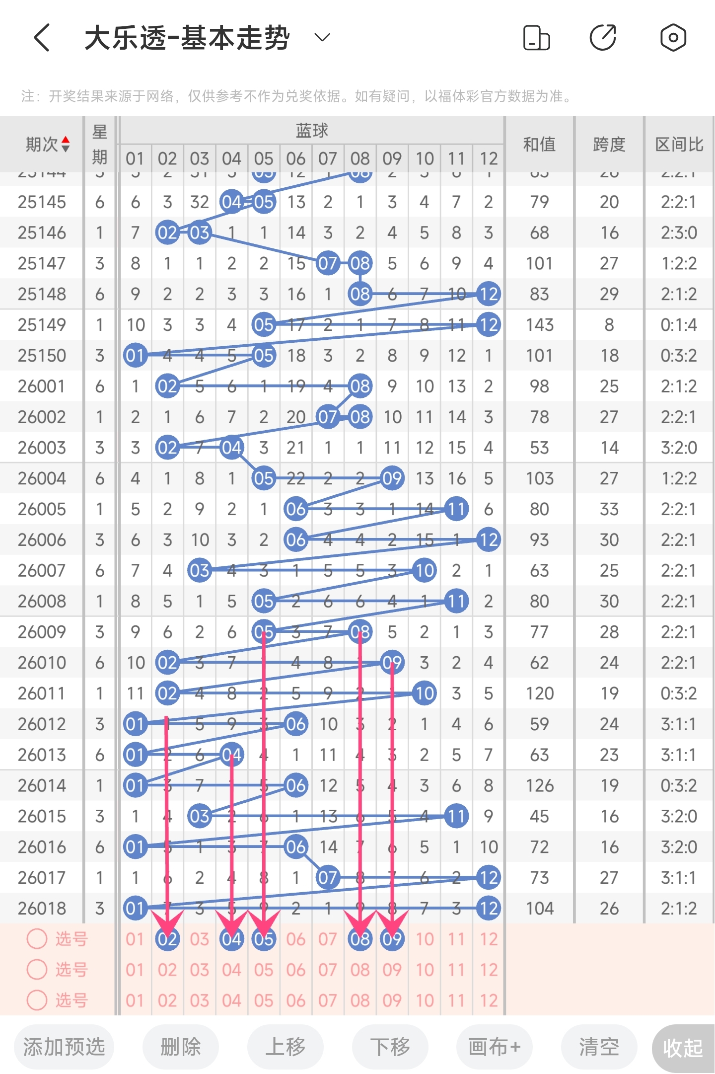 上期开出了1,12号球。往前一期开出了7,12号球。通过分析蓝区走势图,我们可以看到上期跨度变很大了,推测本期跨度应该会有所减少,再结合近期号码走势,本期重点关注靠近中间的号码,其次是防左右两边的号码。最后再结合冷热号情况以及遗漏期数,本期我们可以关注2,4,5,8,9等号。综上所述本期我们推测可能开出2,4,5,8,9等号码。