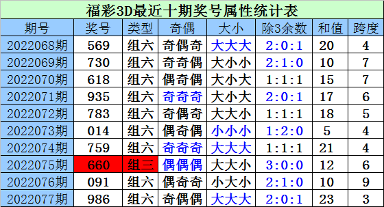 开奖回顾:福彩3D第2022077期奖号为986。其中奖号奇偶比为1:2,大小比为3:0,012路比为2:0:1。