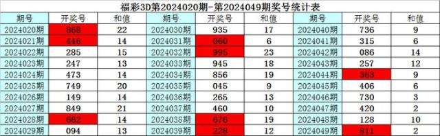 上期回顾:福彩3D第2024049期奖号为:811,其中奖号组选类型为:组三,奇偶比为2:1,大小比为1:2,012路比为0:2:1,和值为10,跨度为7。