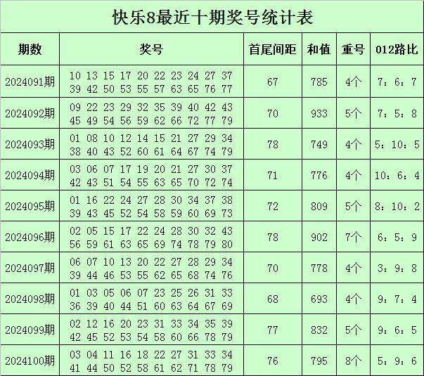 福彩快乐8第2024100期开奖回顾:03 04 11 16 18 22 27 31 33 34 41 44 50 52 58 61 62 71 78 79,其中奖号首尾间距为76,和值为795,012路比为5:9:6,包含5组同尾号码:11-31-41-61-71、22-52-62、03-33、04-34-44、18-58-78,开出8个重号:16、31、33、34、52、58、78、79。