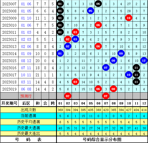 3、在第020期历史同期开奖中,前区奖号最大间距出现范围在5-16区段,其中最大间距奇偶个数比为10:6,012路比为4:6:6,本期预计最大间距出现在16-20之间。