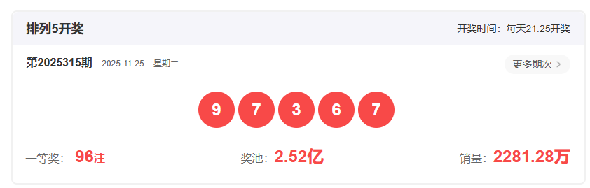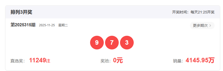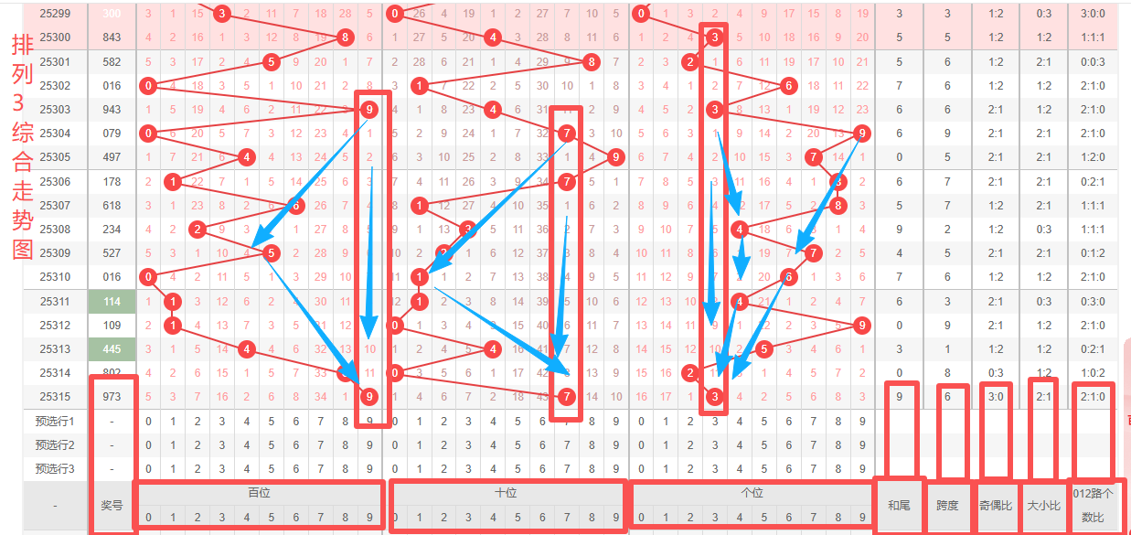 体彩排列3第2025315开奖号码973,形态为组六,奇偶比3:0,和值19,跨度6,大小比2:1,【012】路个数比2:1:0。
