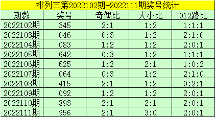 3。号码012路比为11:10:9,2路号码走冷,本期号码012路比参考1:0:2。