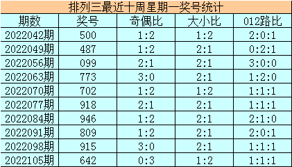 排列三十周星期一分别开出奖号:642、915、809、946、918、702、773、099、487、500,其中号码奇偶比为15:15,奇偶号码基本持平;号码大小比为17:13,大小号码基本持平;号码012路比为14:9:7,0路号码热出。