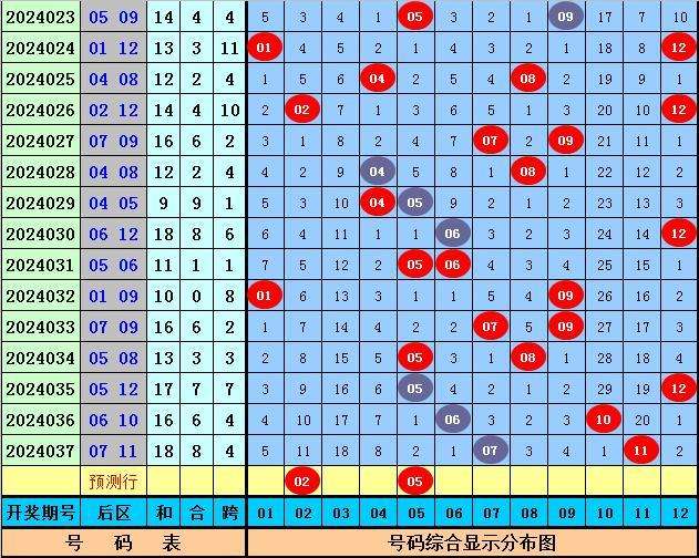 后区分析:上期该位开出奖号07和11,和值为18,跨度为4,后区前4次开出和值18和跨度4时,其下期奖号分别为:10+11、04+05、03+12、08+11,号码奇偶比为4:4,大小比为5:3,012路比为2:2:4,本期后区号码参考02、04、05、06、09,精选两码02、05。