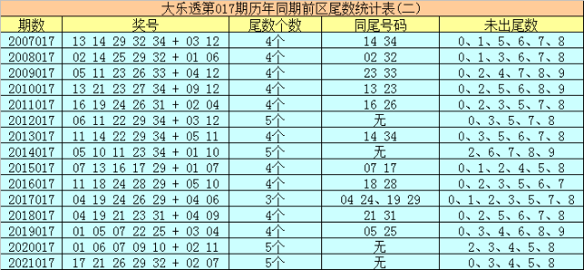 大乐透历年同期第017期后区尾数奇偶比为14:16,最近5年尾数奇偶比为4:6,后区尾数大小比为8:22,最近5年尾数大小比为3:7,本期后区注意号码04、06、10、11、12,后区两码关注11、12。