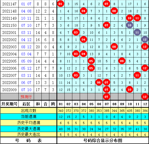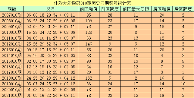 6、在第010期历史同期开奖中,后区奖号跨度分别开出:2-2-4-7-2-2-2-2-5-3-1-8-10-7-3,跨度范围在1-10之间,本期后区跨度参考5。