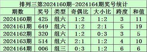 上期回顾:排列三第2024164期开奖号码为006。奖号类型为组三,奇偶比为0:3,大小比为1:2,跨度为6,和值为6。