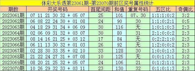 上期回顾:体彩大乐透第2023070期开出奖号:10 26 29 32 33 + 03 11,前区奖号首尾间距为23,和值为130,五区比为0:1:0:1:3,奇偶比为2:3。