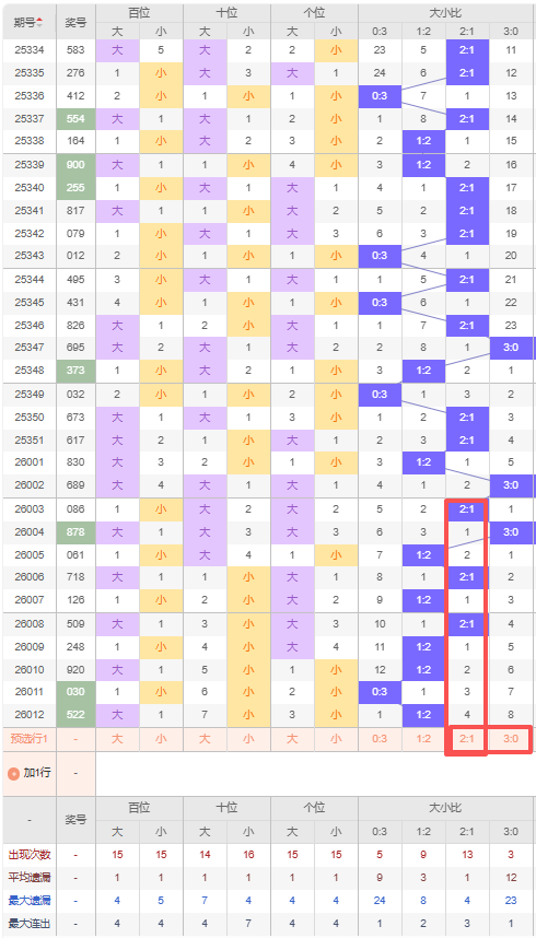 上期大小比:1:2,近10期大小比出现情况:2:1、3:0、1:2、2:1、1:2、2:1、1:2、1:2、0:3、1:2,最近10期出3期2:1,出现5期1:2,出现1期0:3,出现1期3:0,根据近10期出号规律本期推荐遗漏4期出2:1,防遗漏8期出3:0,综上所述大小比推荐:防:3:0,重点关注:2:1。