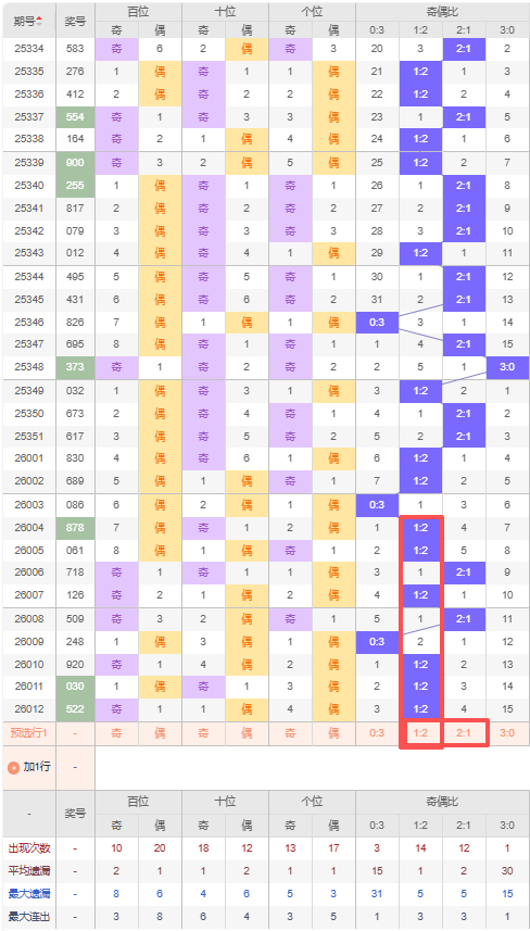上期奇偶比:1:2,近10期奇偶比出现情况:0:3、1:2、1:2、2:1、1:2、2:1、0:3、1:2、1:2、1:2,最近10期出现2期2:1,出现6期1:2,出现2期0:3,出现0期3:0,根据近10期出号规律本期推荐四连出1:2,防遗漏4期出2:1,综上所述奇偶比推荐:防:2:1,重点关注:1:2。