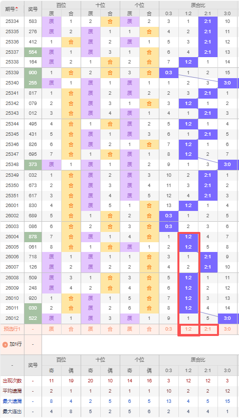 上期质合比:3:0,近10期质合比出现情况:0:3、1:2、1:2、2:1、2:1、1:2、1:2、1:2、1:2、3:0,最近10期出现2期2:1,出现6期1:2,出现1期0:3,出现1期3:0,根据近10期规律本期推荐隔期出1:2,防遗漏5期出2:1,综上所述质合比推荐:防:2:1,重点关注:1:2。