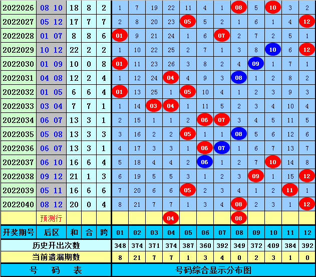 后区分析:后区上期开出2路+0路奖号08和12,最近20期后区0路奖号开出15个,1路奖号出现15个,2路奖号出现10个,最近8期前区0路奖号出现7个,1路奖号出现4个,2路奖号出现5个,本期后区注意号码:02、04、05、08、12,单挑两码组合04+08。