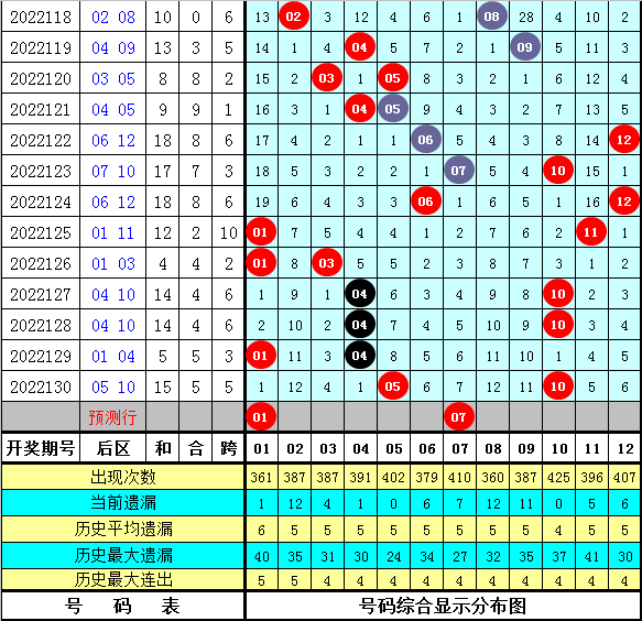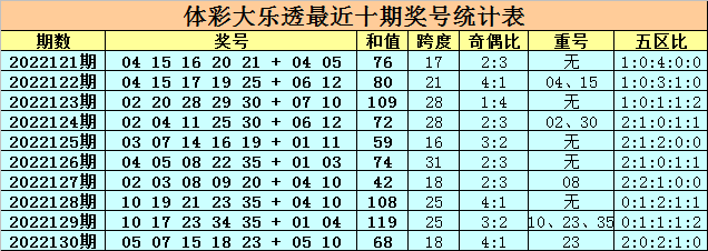 上期开奖:大乐透第2022130期奖号为:05 07 15 18 23 + 05 10,前区号码和值为68,跨度为18,奇偶比为4:1,重号:23,五区比为2:0:2:1:0。