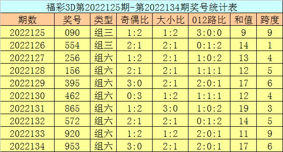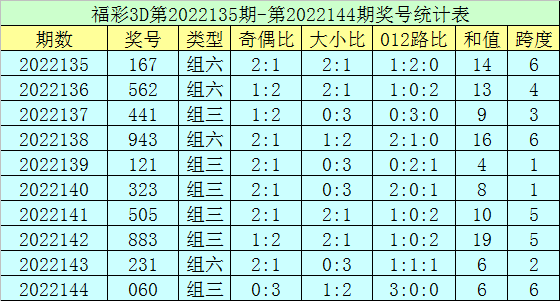 上期回顾:福彩3D第2022144期开奖号码为060,组选类型为组三,奇偶比为0:3,大小比为1:2。